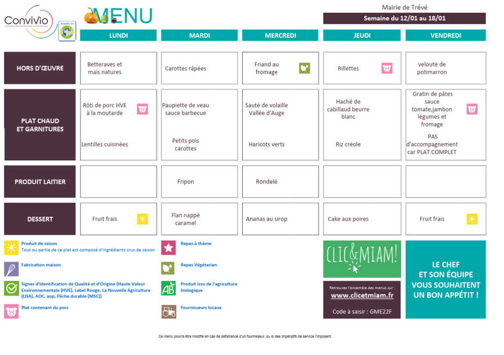 / Menu Cantine Trévé : semaine du 12 au 16 janvier