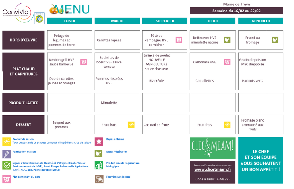 / Menu Cantine Trévé : semaine du 16 au 20 février