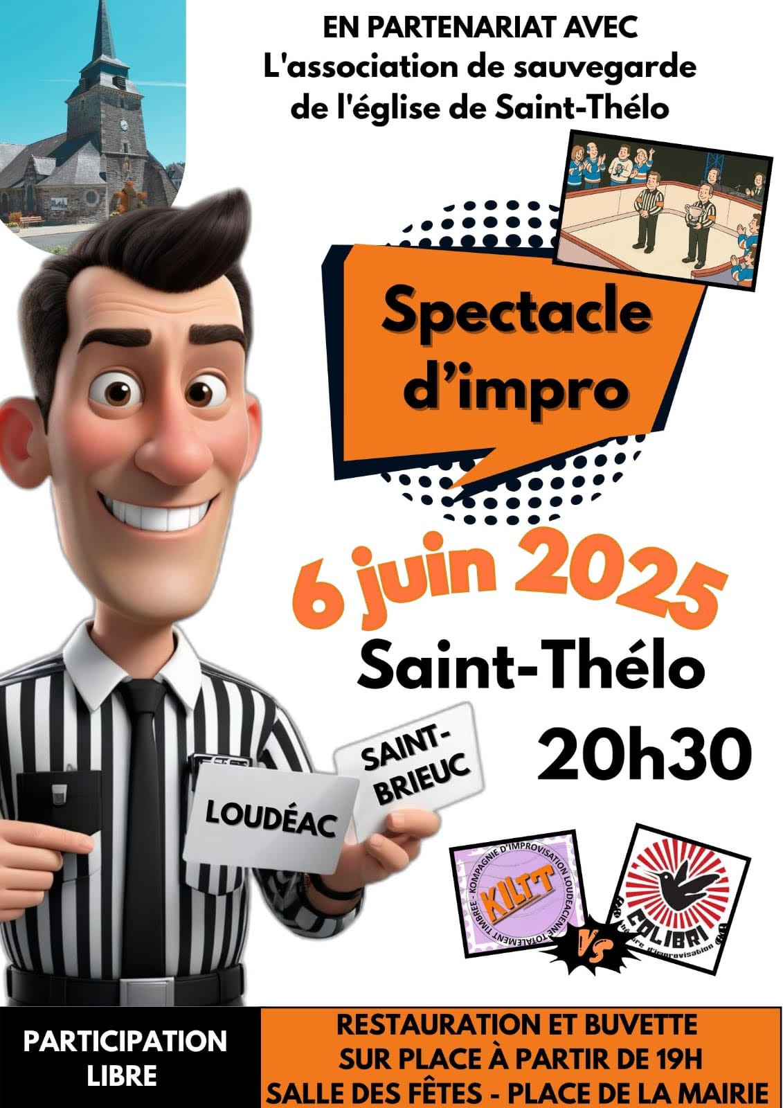 La KILTT, Kompagnie d'Improvisation Loudéacienne Totalement Timbrée, et L'association de Sauvegarde de l'Eglise de Saint Thélo vous invite à un spectacle de théâtre d'improvisation le Vendredi 6 Juin 2025 à 20h30 et ont invité le Colibri de Saint Brieuc pour jouer avec eux.