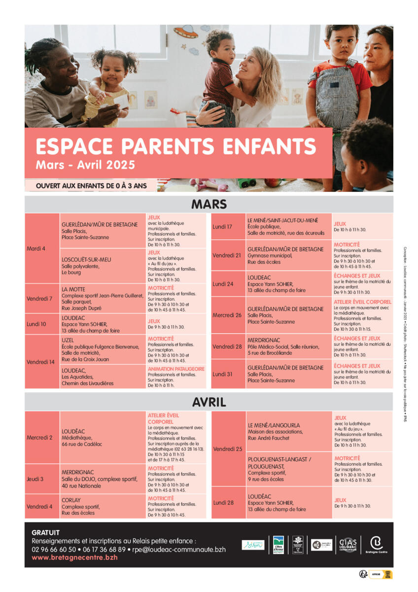 Les calendriers mars-avril 2025 des animations Bébés lecteurs et Espace parents enfants, sur le territoire.