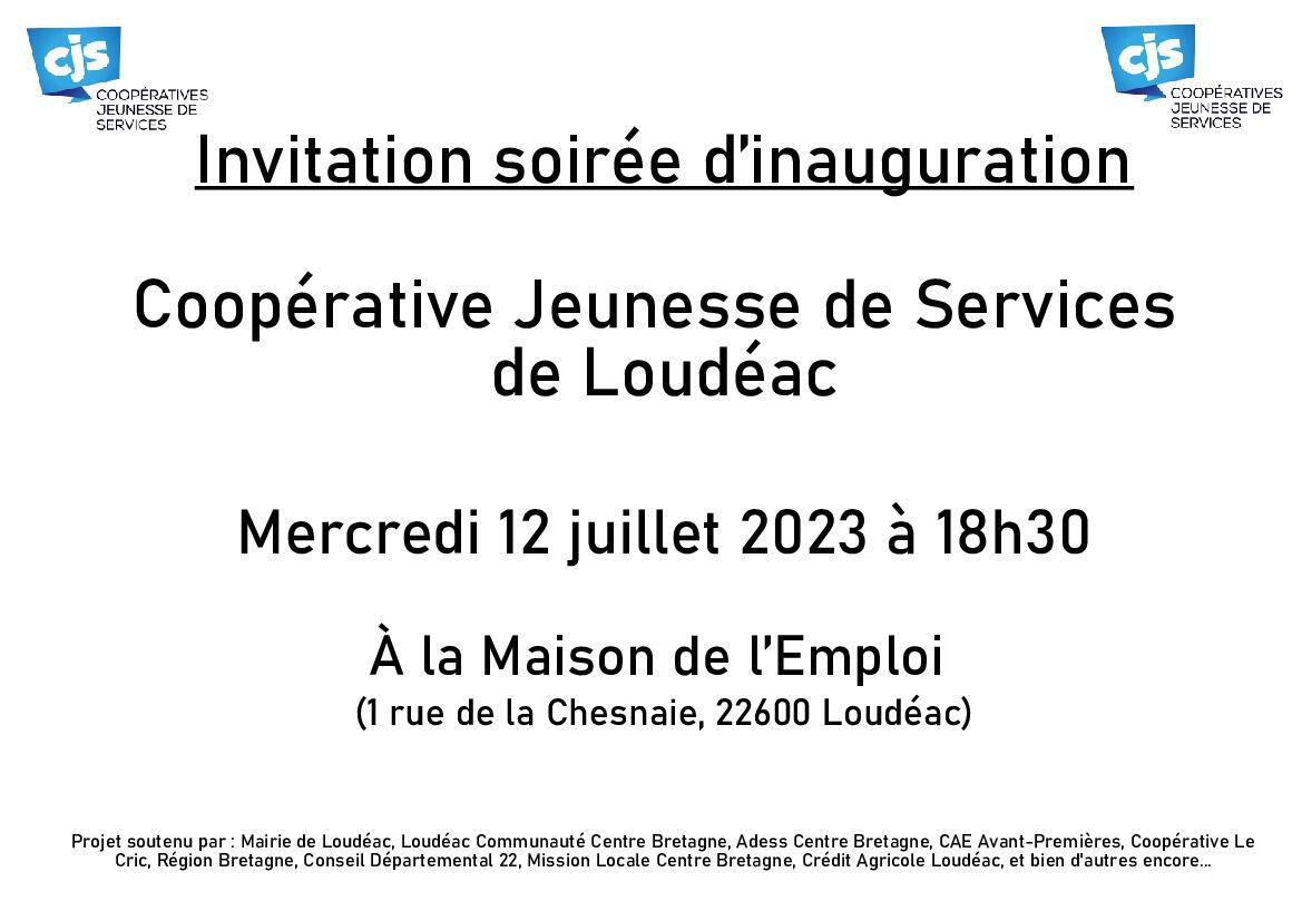 Vous trouverez ci-joint une invitation à la soirée d'inauguration de la CJS qui se tiendra le mercredi 12 juillet à partir de 18h30 à la Maison de l'Emploi de Loudéac (1 rue de la Chesnaie, 22600 Loudéac).