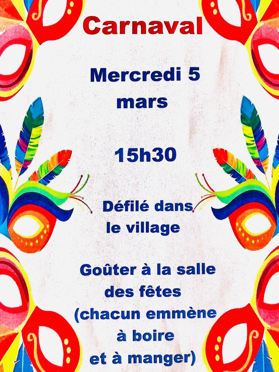 Rendez-vous le mercredi 5 mars à 15h30 à la salle des fêtes pour un défilé dans le village suivi d’un goûter !