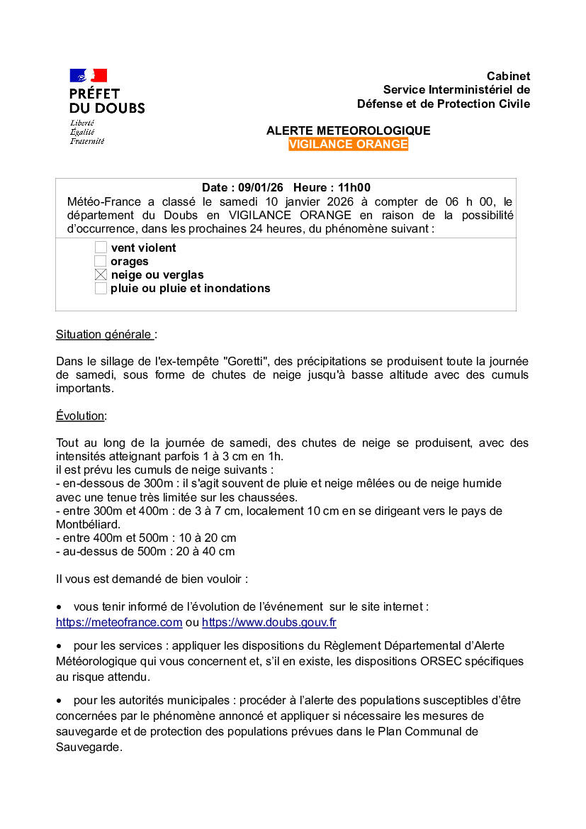 Message d'alerte de la préfecture du Doubs - Neige