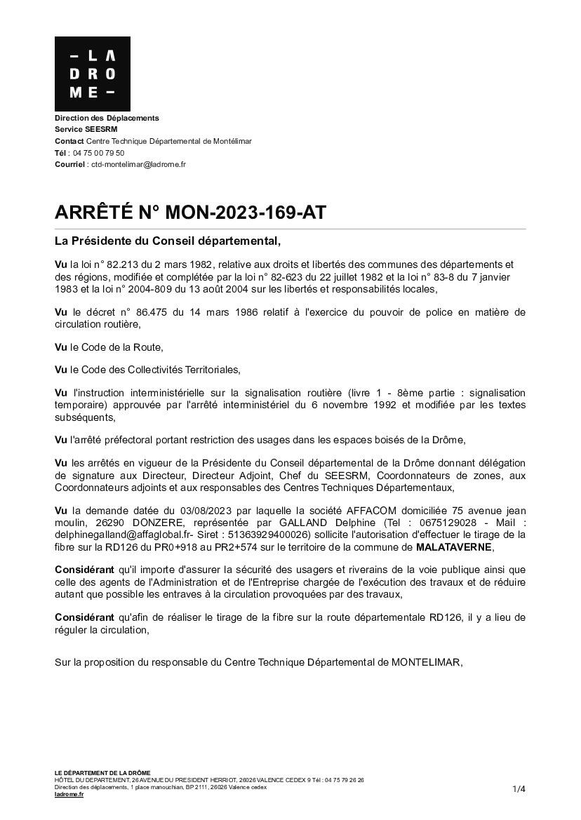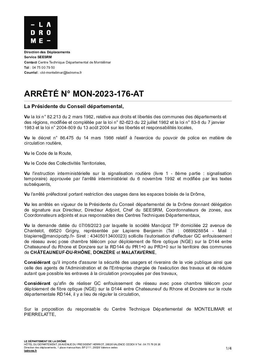 - Du 22/08 au 22/09, de 8h à 17h30 : déploiement de la fibre sur la RD 144 entre Donzère et Châteauneuf (léger impact du côté des Joannins pour le territoire malatavernois).