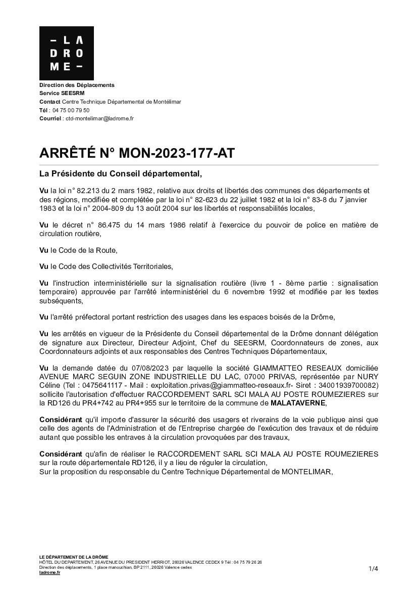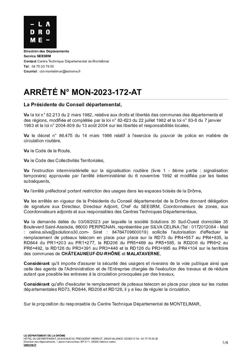 - Du 4/09 au 6/10, de 9h à 16h : remplacement d'une série de vieux poteaux Télécom sur la RD 126, en divers points entre Châteauneuf-du-Rhône et Allan, en passant par Malataverne.