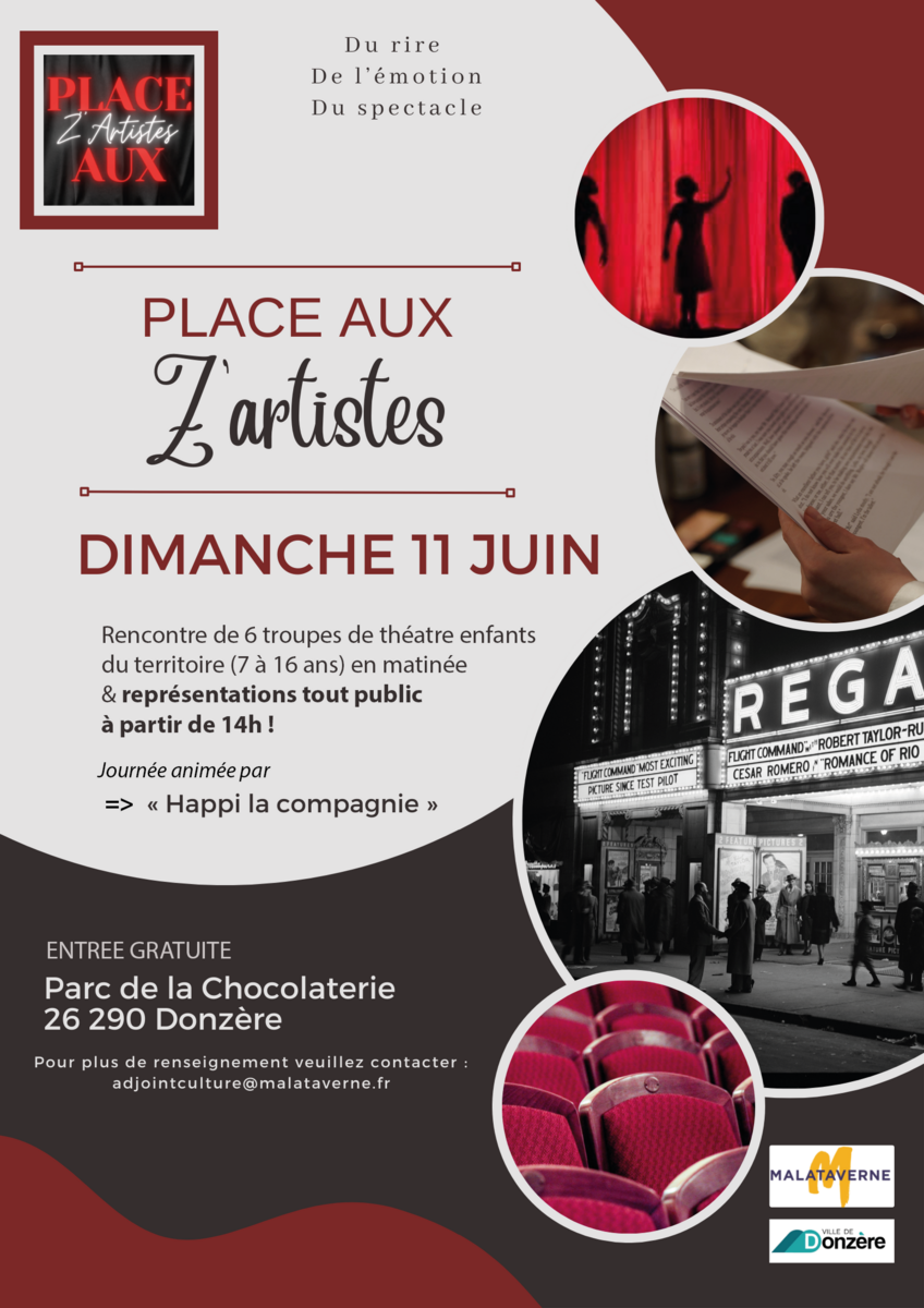 Les communes de Malataverne & Donzère s'associent pour organiser une grande rencontre de troupes de théâtre enfants du territoire (âgés de 7 à 16 ans), dimanche 11 juin, sur la scène de la Chocolaterie à Donzère : Place aux Z'artistes ! Après une matinée de rencontre des troupes en matinée, le public sera accueilli dès 14h pour une série de représentations (spectacles gratuit - tout public).