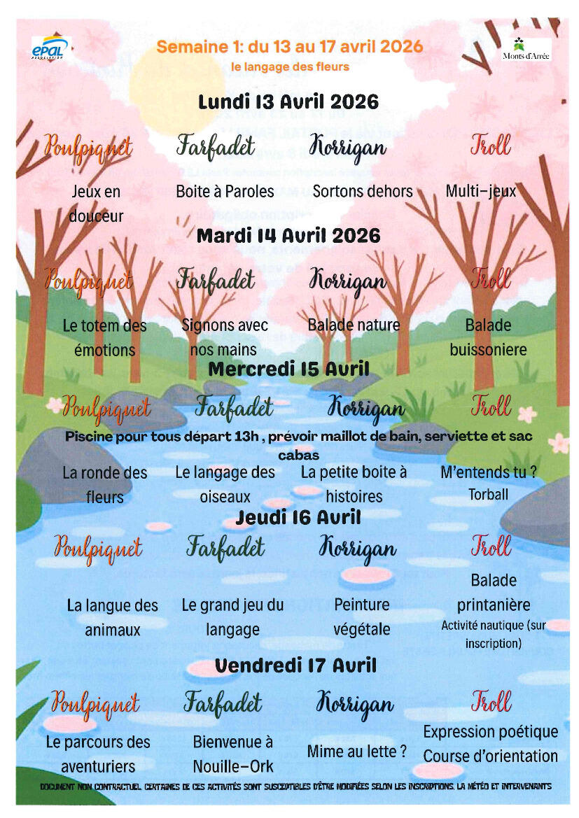 Voici le programme activités sportives des vacances de printemps de l'accueil de loisirs :