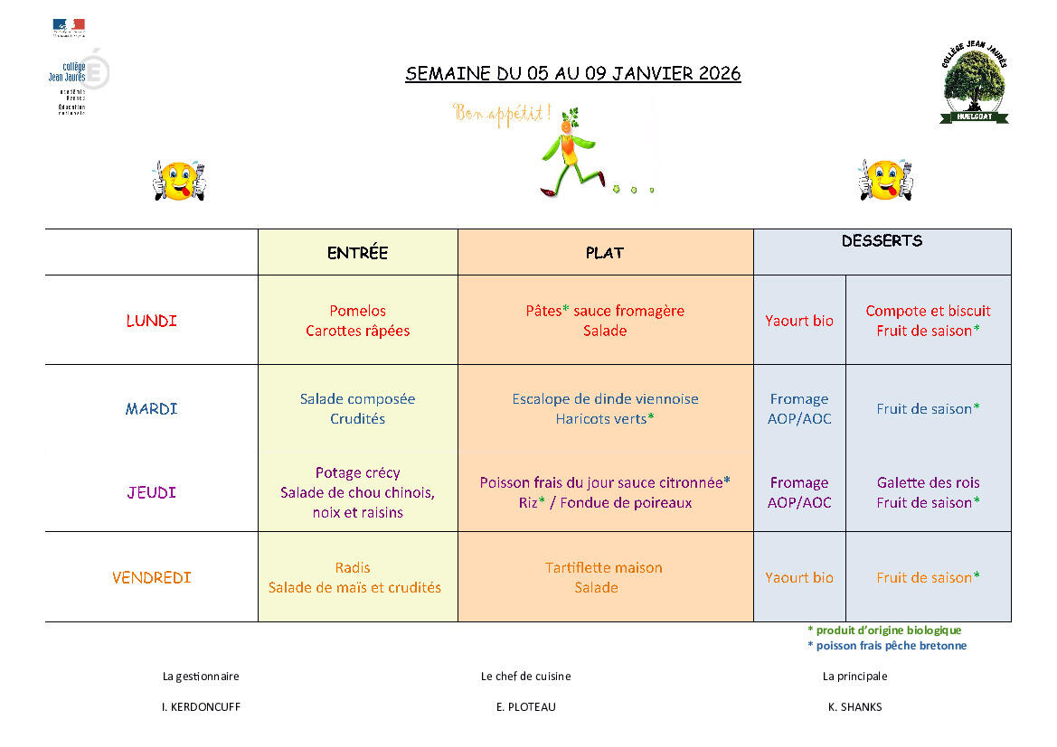 Menu cantine École / Collège du 05 au 09 janvier 2026