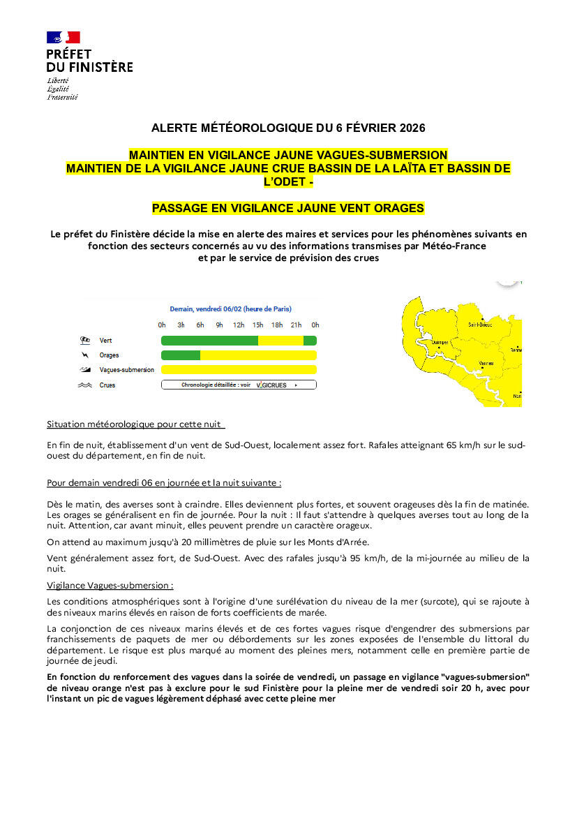 Le département du Finistère sera placé en vigilance JAUNE ORAGES, VENT DEMAIN ET SERA MAINTENU EN VIGILANCE JAUNE VAGUES-SUBMERSION, JAUNE CRUE ODET ET LAITA.
