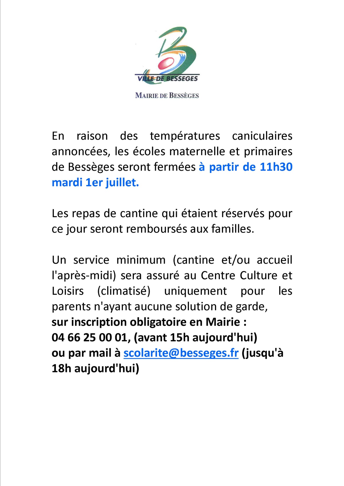 / Canicule : fermeture des écoles mardi 1er juillet après-midi