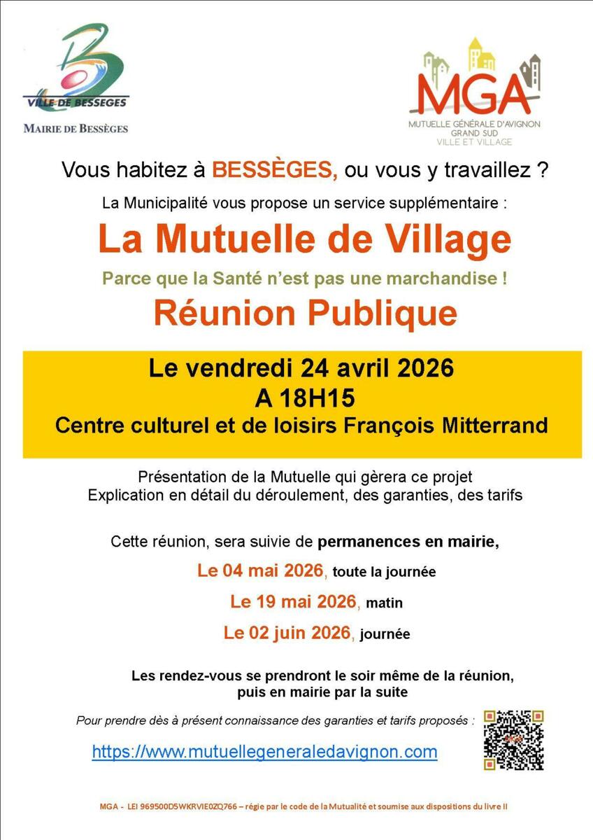 Une réunion publique aura lieu le vendredi 24 avril 2026 à 18h15 au Centre Culturel et de Loisirs François Mitterrand pour la présentation de la Mutuelle de Village.