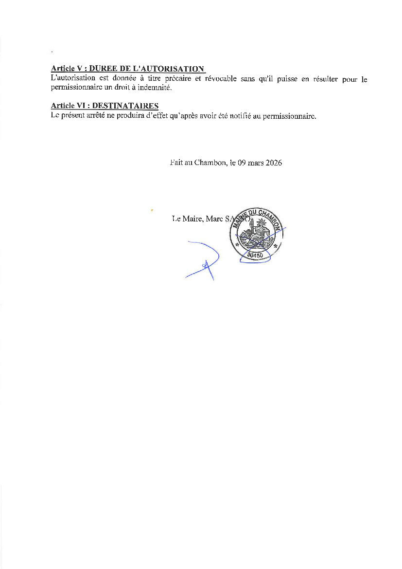 Le pétionnaire AXIANS de NIMES est autorisé à utiliser la voirie communale D29 - Le Martinet Neuf - du 16 mars 2026 pour 15 jours en vue de réaliser des travaux de tirage de fibre optique en aérien sur le réseau Orange