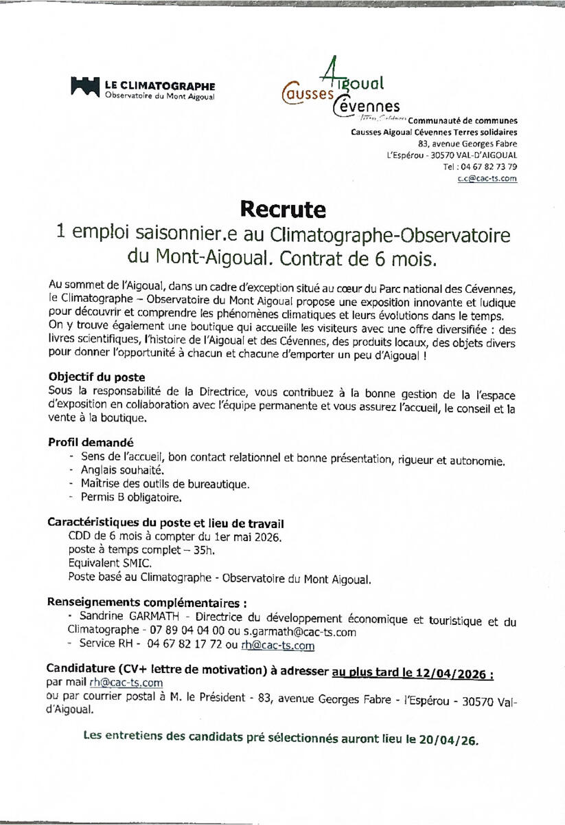 OFFRE D'EMPLOI COMMUNAUTÉ DE COMMUNES CAUSSES AIGOUAL CÉVENN