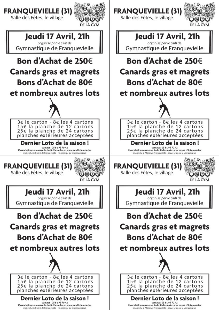 Ne manquez pas le LOTO organisé par la Gym de Franquevielle ce jeudi 17 Avril 2025 à 21 h dans la salle des fêtes de Franquevielle !