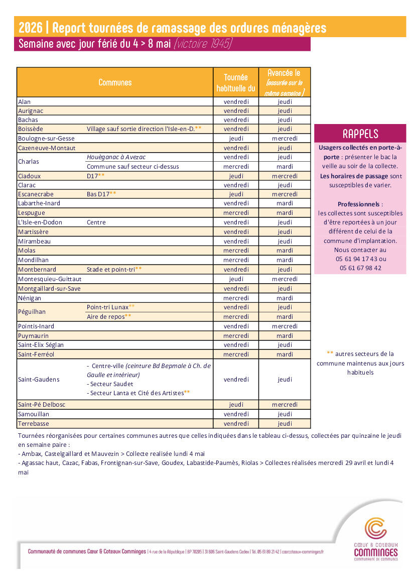 2026 | Report tournées de ramassage des ordures ménagères Semaine avec jour férié du 4 > 8 mai (victoire 1945)