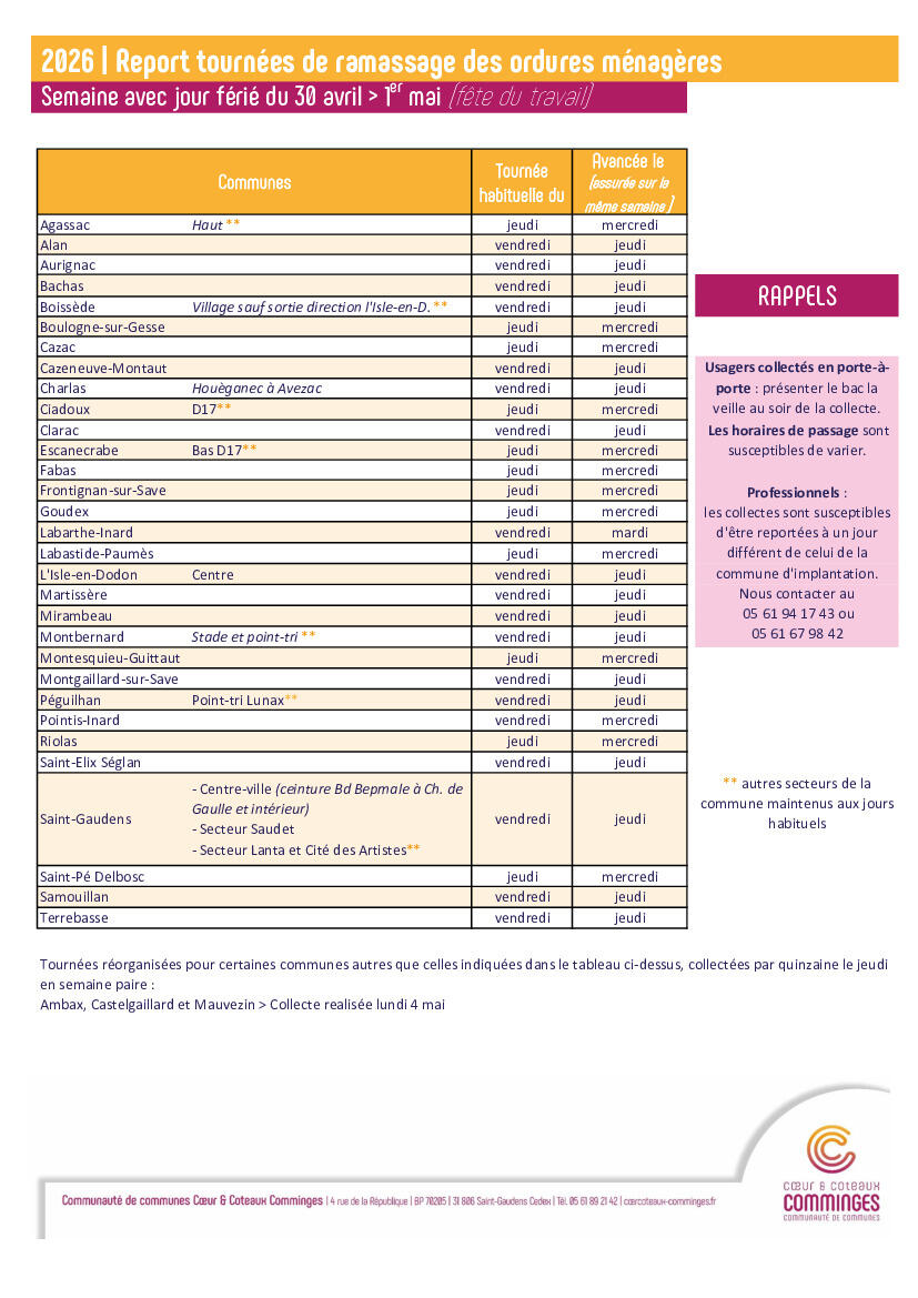 Report collecte ordures ménagères semaines du 1er et du 8Mai