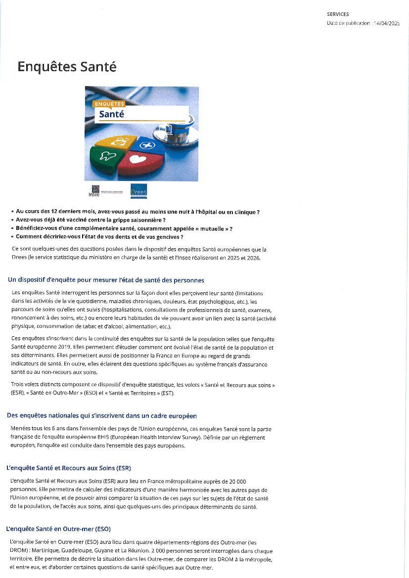 Veuillez trouver ci-joint, l'avis d’enquête INSEE annonçant l'Enquête sur la Santé et le Recours aux Soins (ESR) 2025.