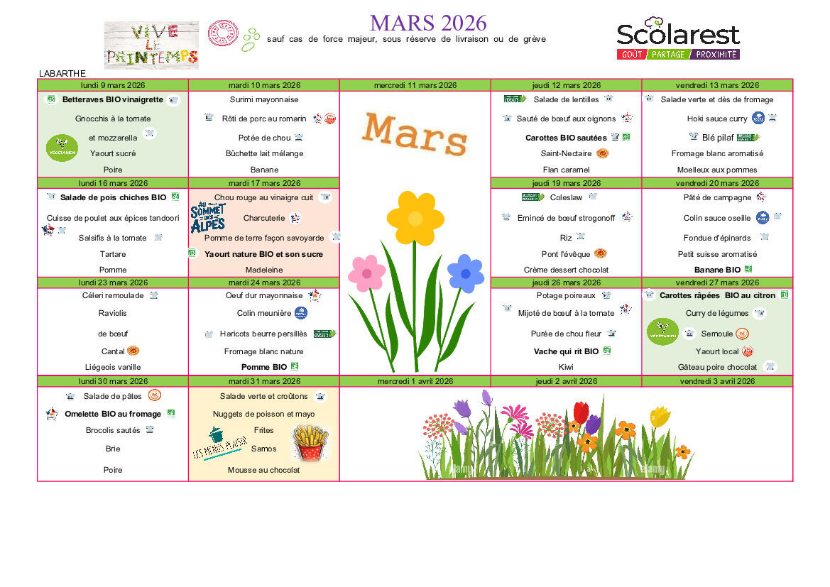 / Menu de mars - Cantine scolaire