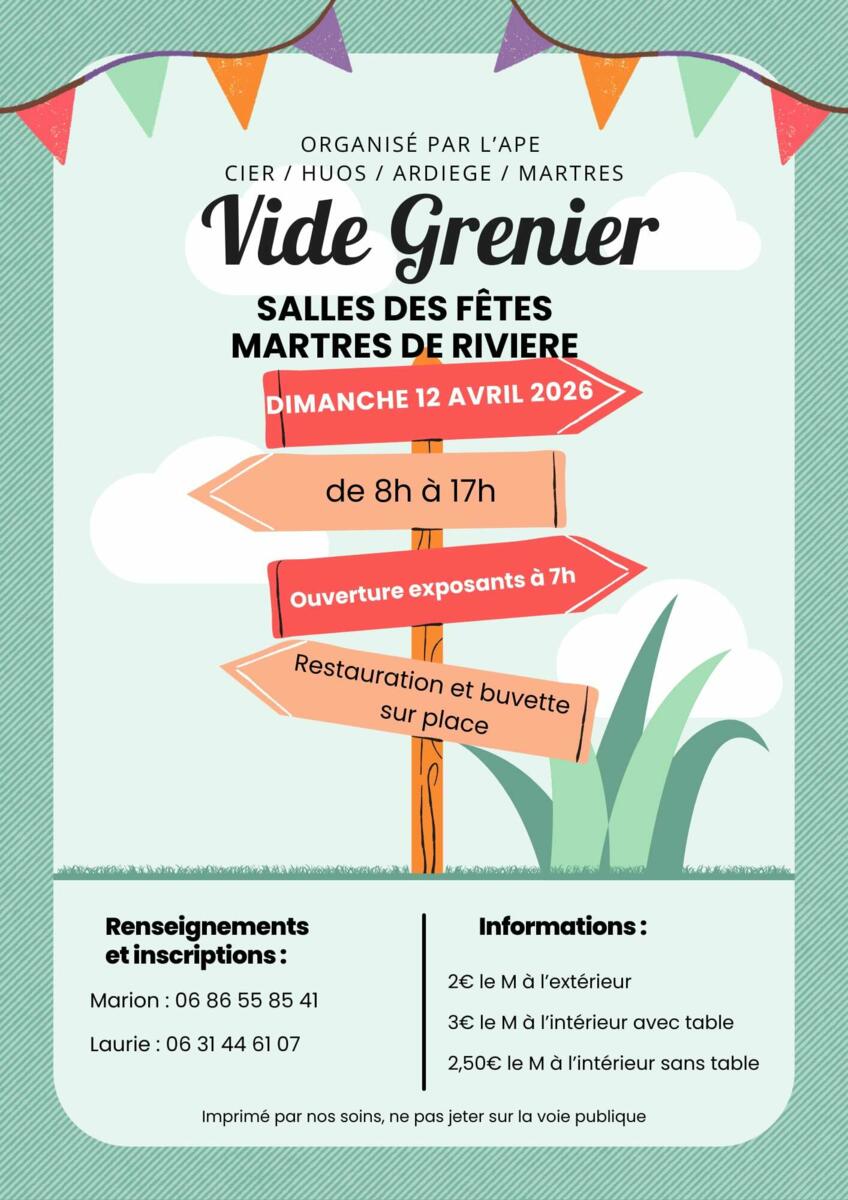 Vide Grenier 10/04/2026 Vide grenier le 12 Avril de 7h à 17h à la salle des fêtes de Martres de Rivière Buvette et Restauration sur place