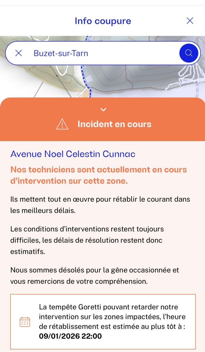 Une coupure d’électricité a lieu actuellement sur la commune de Buzet sur Tarn et de Saint Sulpice la Pointe .