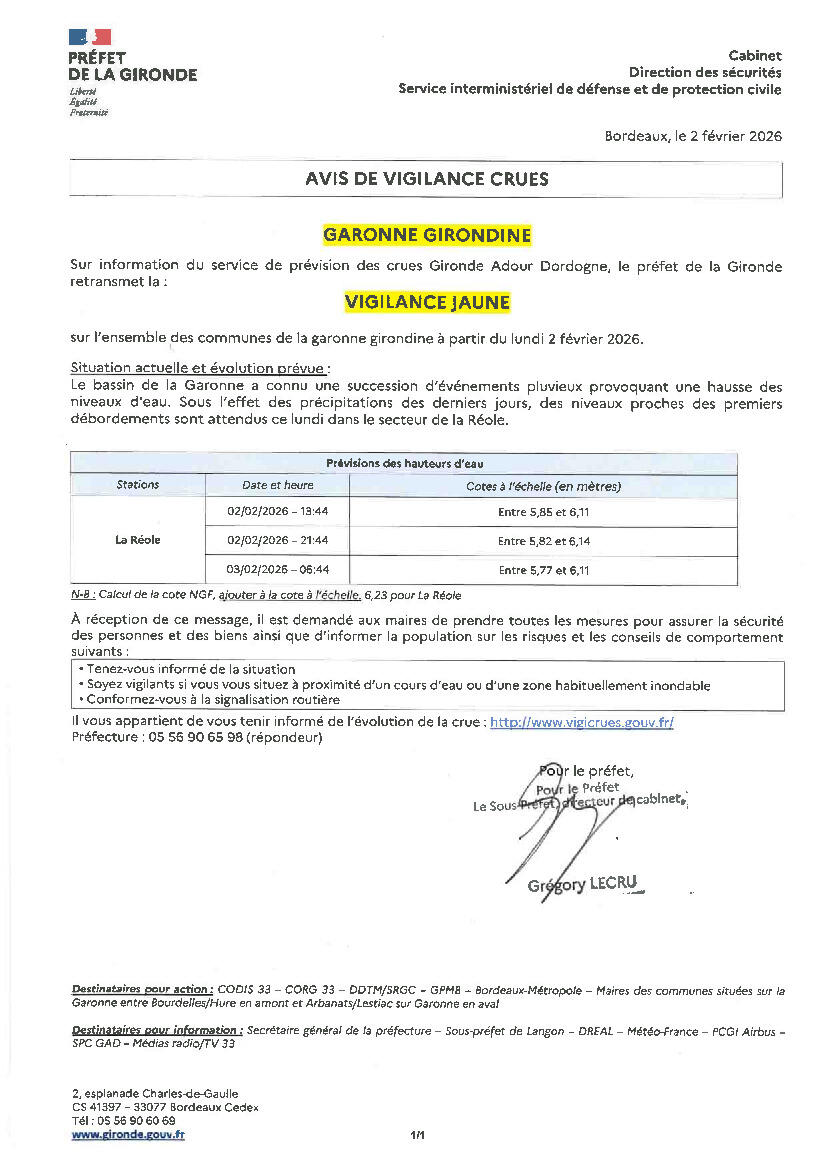 MESSAGE DE LA PRÉFECTURE DE LA GIRONDE : CRUES