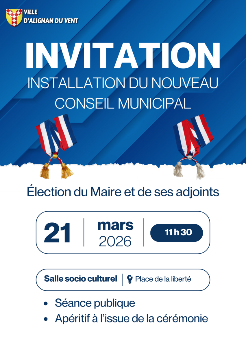 Nous avons le plaisir de vous convier ce samedi 21 mars 2026 à 11 h 30 à l'installation du nouveau conseil municipal, qui sera marquée par l'élection du Maire et des Adjoints.