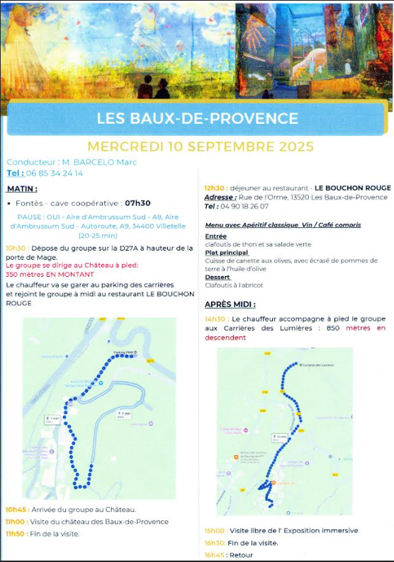 Le président, Joël Pellé, informe que suite au mouvement annoncé ce jour là le voyage des Ainés du Céressou du mercredi 10 septembre 2025 Aux Baux de Provence aura bien lieu.