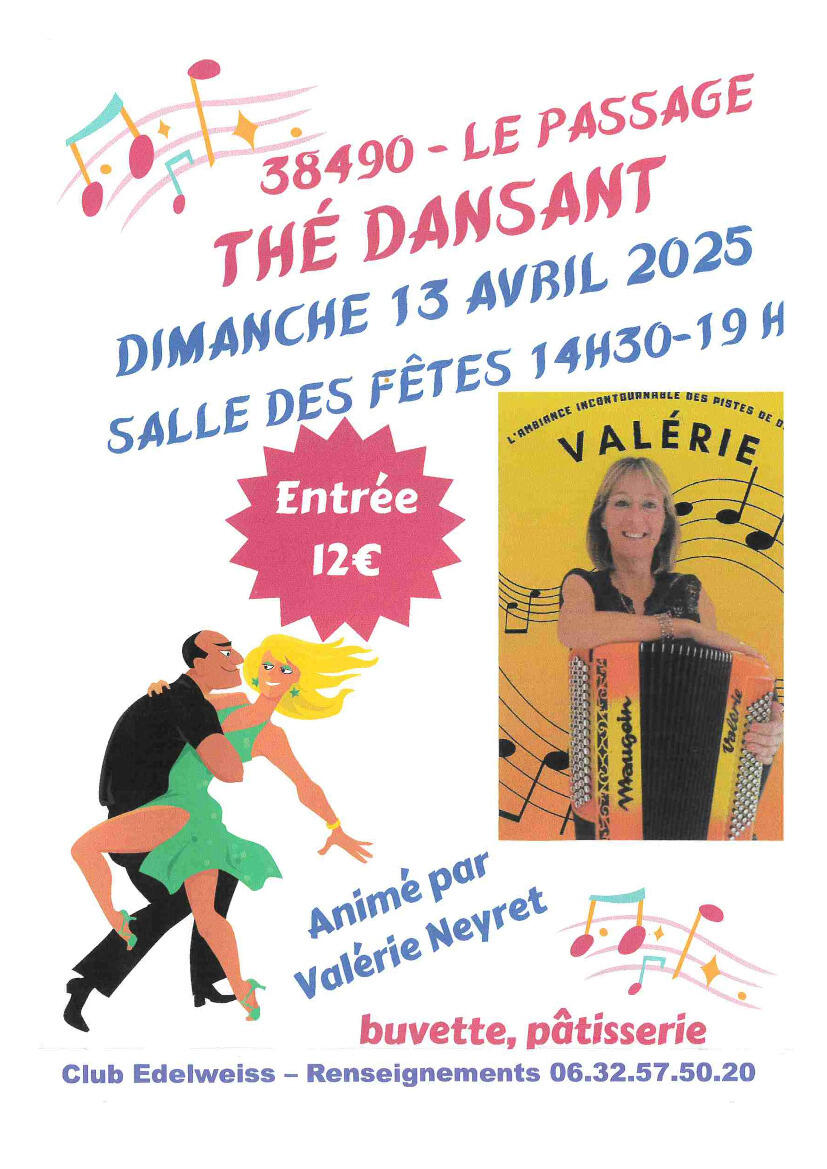 Le club Edelweiss organise un thé dansant le dimanche 13 avril 2025, après-midi de 14h30 à 19h00, à la salle des fêtes Camille Barbier.