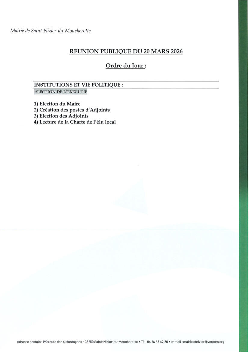 Veuillez trouver ci-joint l'ordre du jour du prochain conseil municipal qui aura lieu vendredi 20 mars, à 20h00, salle du conseil.
