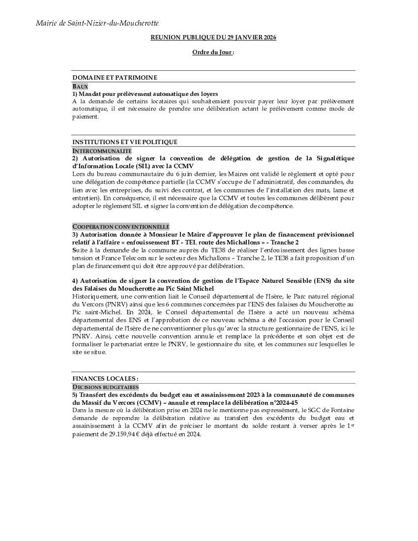 Veuillez trouver ci-joint l'ordre du jour du conseil municipal qui se tiendra jeudi 29 janvier 2026, à 20h 30 en salle du conseil.
