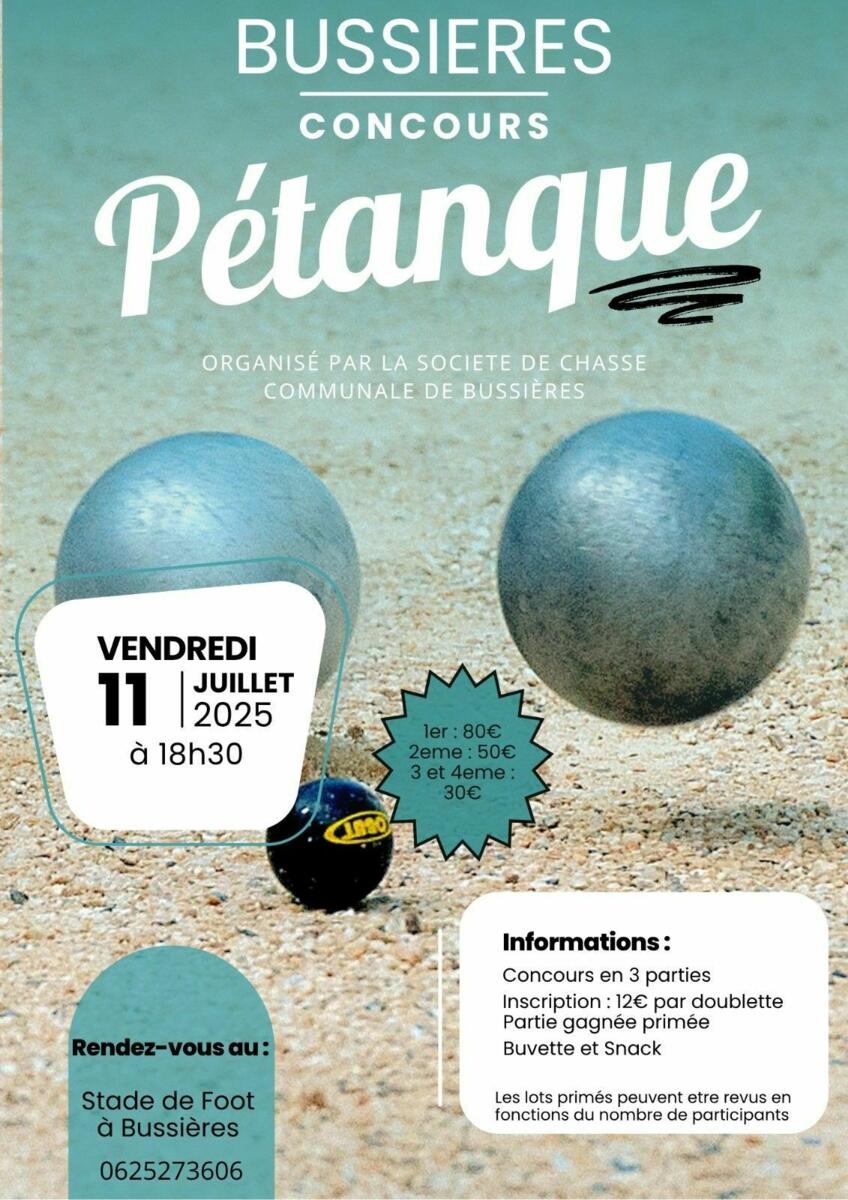 La société de chasse communale de Bussières organise un concours de pétanque le vendredi 11 juillet 2025 à 18h30 au stade de football.