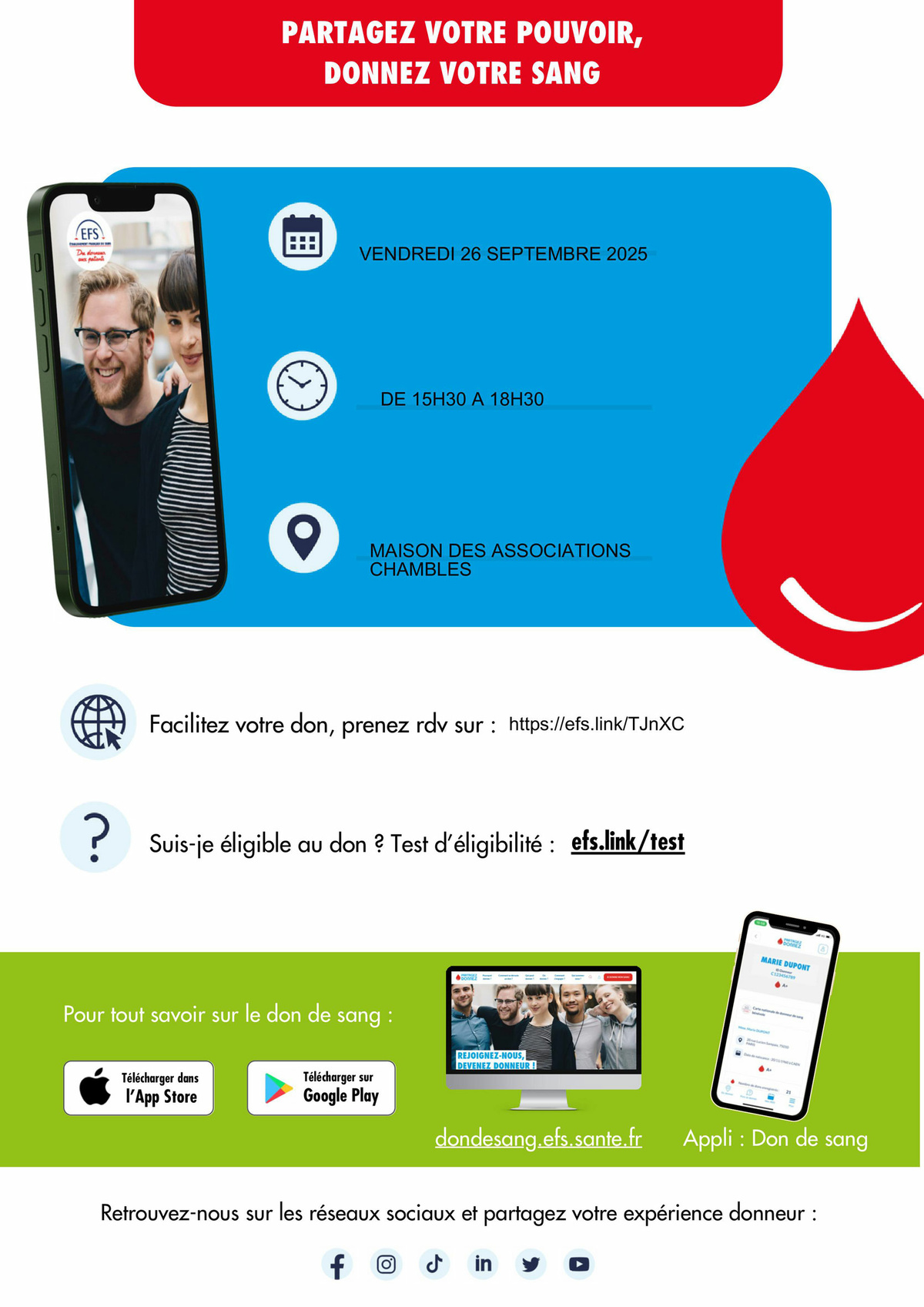 La collecte sur Chambles aura lieu le vendredi 26 septembre 2025 de 15h30 à 18h30 à la Maison Des Associations.