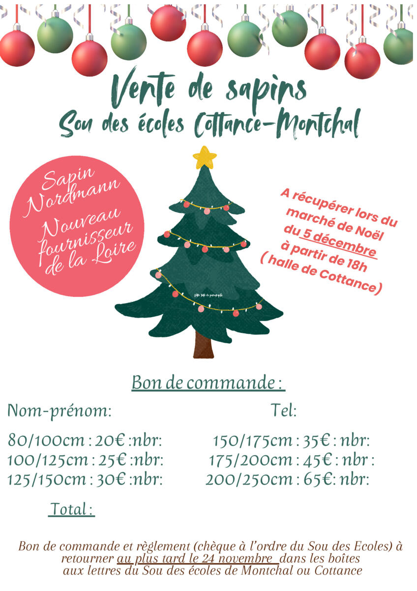 Comme chaque année, le Sou des Ecoles vous propose une vente de sapin, vous pouvez demander votre bon de commande à l'adresse mail suivante : communedecottance@gmail.com