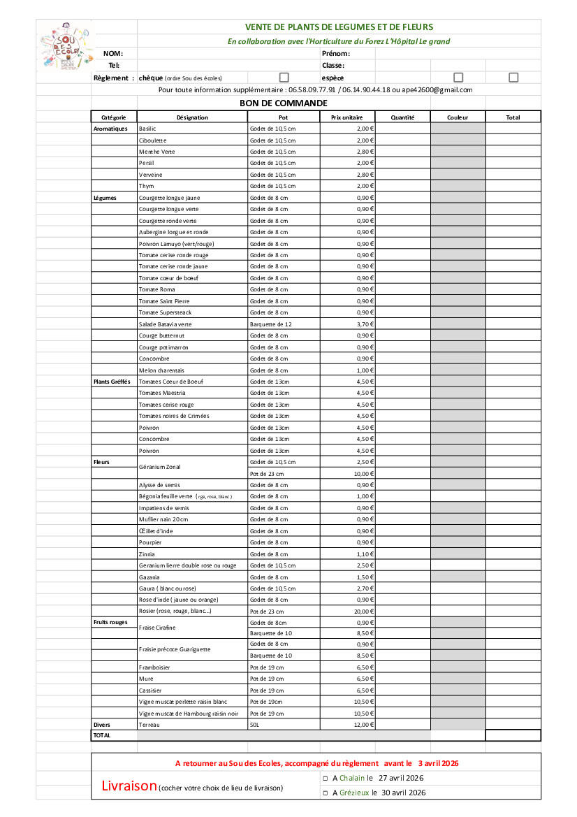 Le SOU des écoles vous propose une vente de plants de légumes, fruits et fleurs.