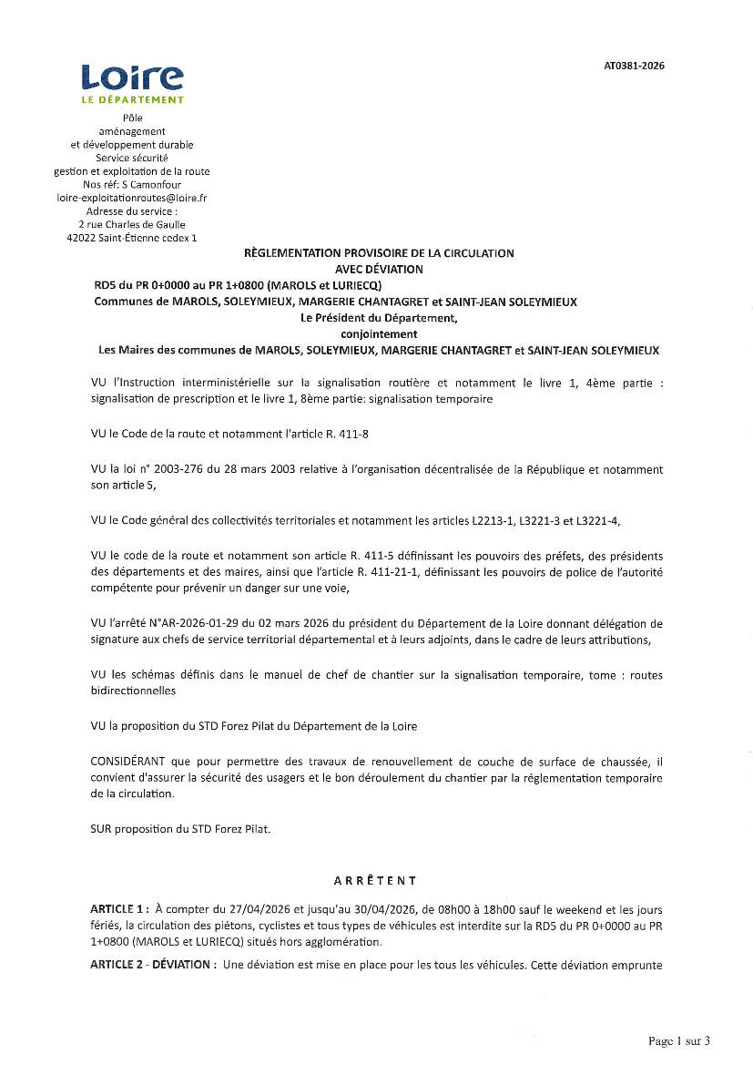 La RD5, en direction de Saint Bonnet le Château, sera fermée du 27/04/26 au 30/04/26 pour raison de travaux.