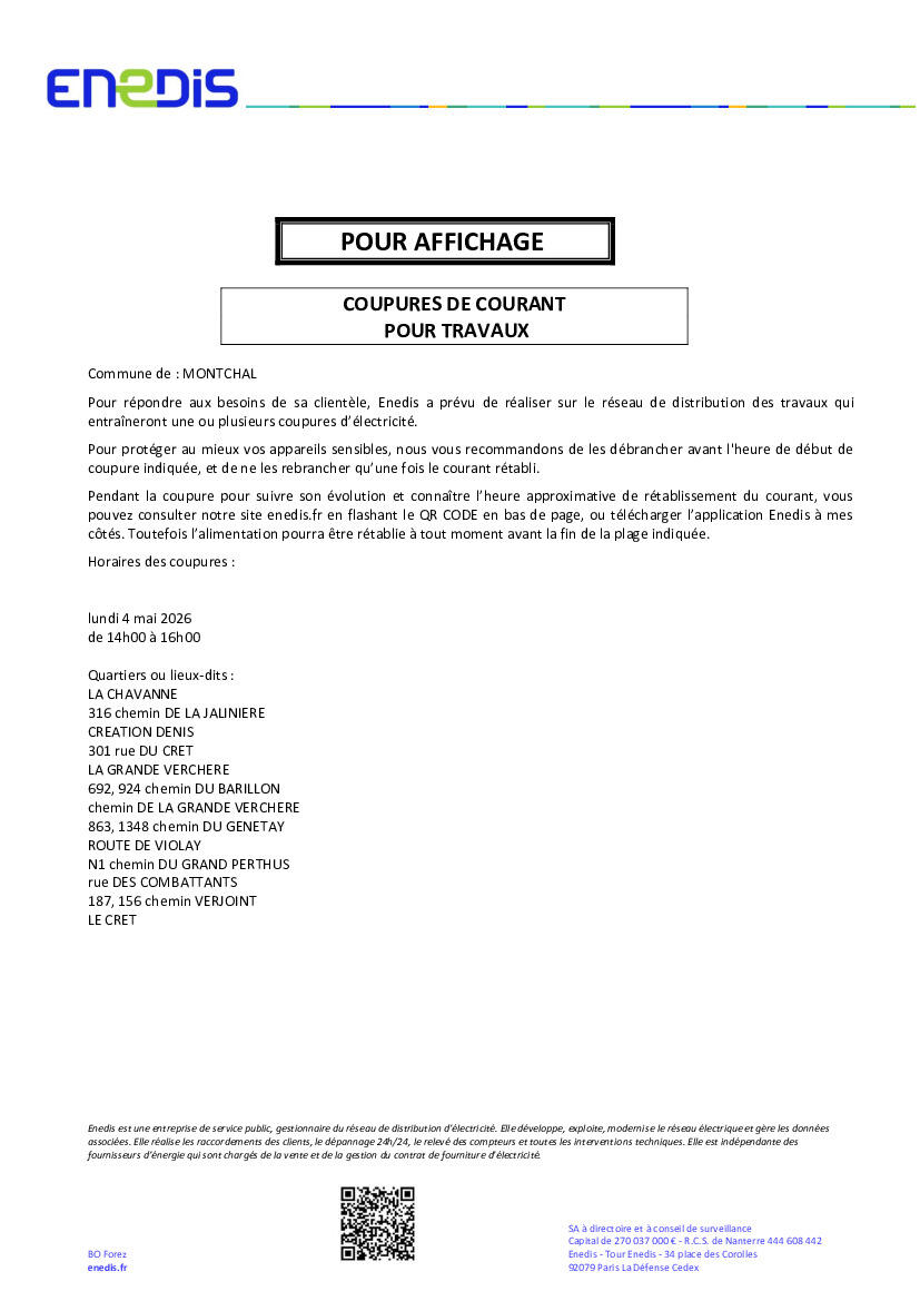 🔌 Coupure d’électricité programmée – Montchal 4 mai 2026