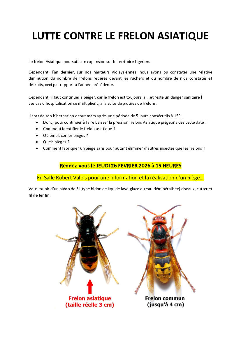 Rendez-vous le JEUDI 26 FEVRIER 2026 à 15 HEURES en Salle Robert Valois pour une information et la réalisation d’un piège…