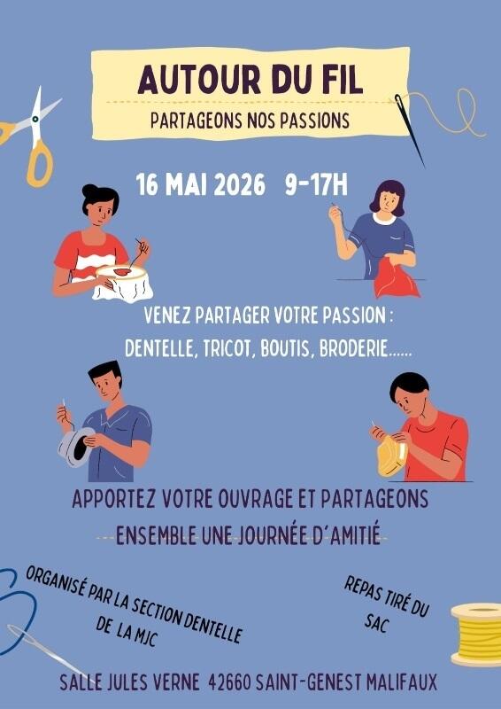 La section Dentelle Aux Fuseaux de la MJC de St Genest Malifaux vous invite à venir partager votre passion du fil (Tricot, Couture, Crochet ... ).