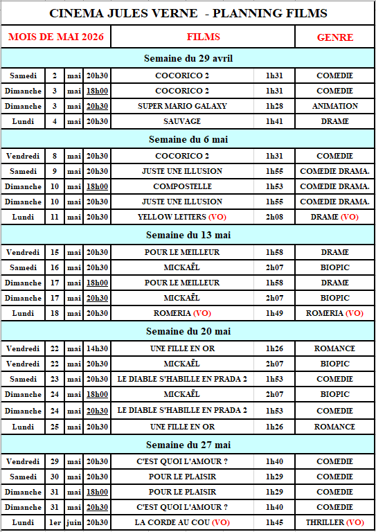 Bonjour à toutes et à tous, voici la programmation du cinéma du mois de mai 2026 ...