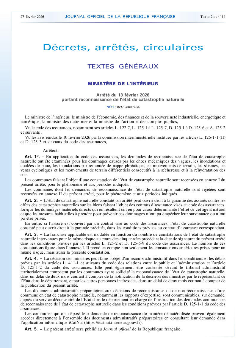 A compter de la date de parution au JO (27 février 2026), les sinistrés ont 30 jours pour faire leur déclaration auprès de leur assurance, s’ils ne l’ont pas faite auparavant.