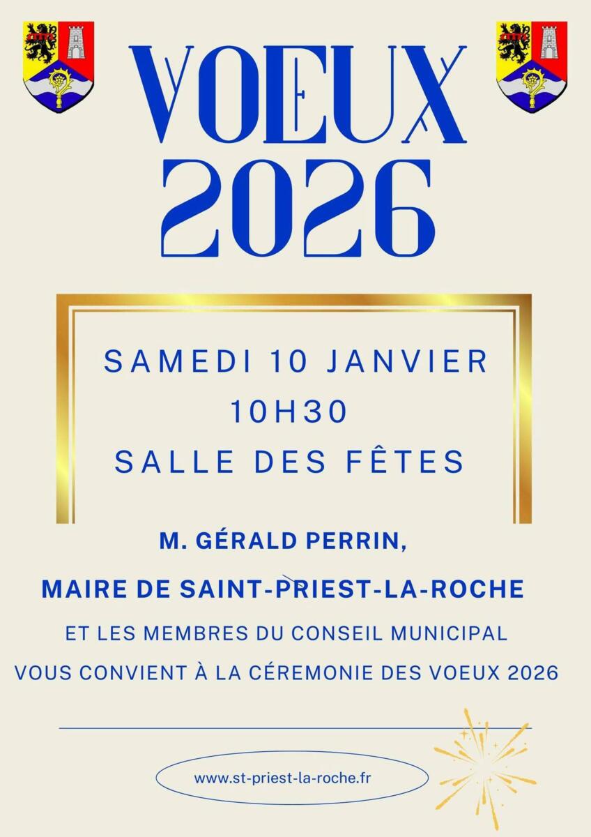 CÉRÉMONIE DES VŒUX 2026 26-01-09 Cérémonie des voeux 2026 Samedi 10 janvier à 10h30 Salle des fêtes Saint-Priest-la-roche