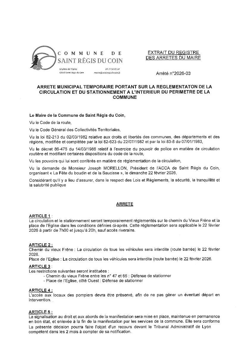 Ci-joint l'arrêté règlementant la circulation et le stationnement pour la fête du boudin le dimanche 22 février.