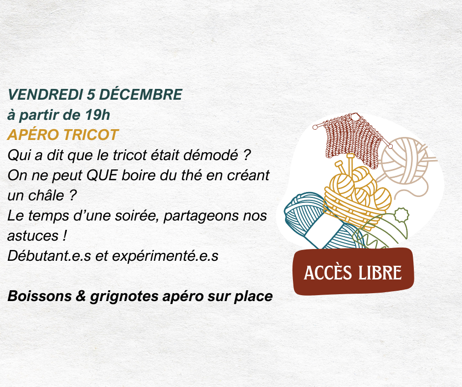 🧶vendredi, soirée apéro tricot dès 19h, boissons et grignotes sur place