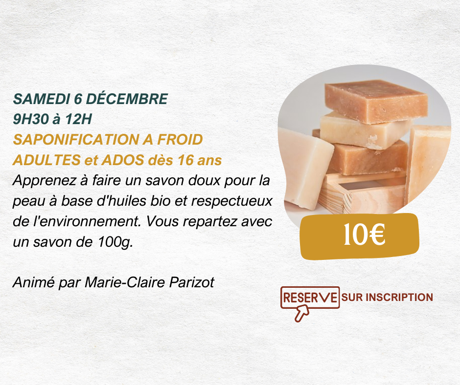 🧽samedi, atelier de saponification à froid avec Marie-Claire ; il reste 2 places !