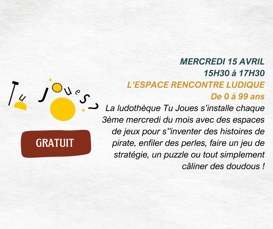 🎲Mercredi de 15h à 17h l'espace rencontre ludique avec la ludothèque Tu Joues