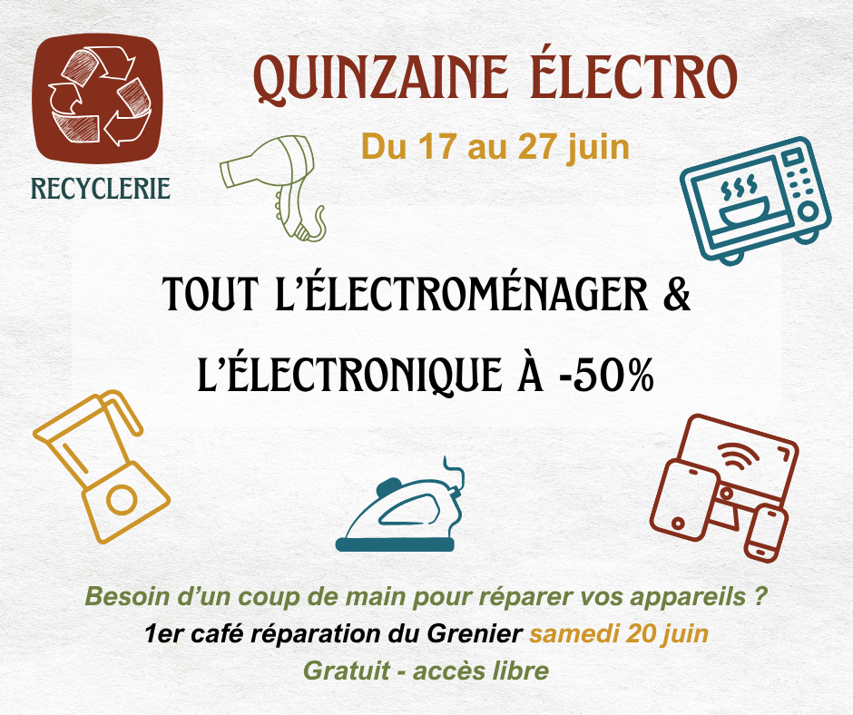 Tout le matériel électroménager-électronique de la recyclerie est à -50% pendant 2 semaines ! La recyclerie est ouverte les mercredis & samedis de 10h à 19h