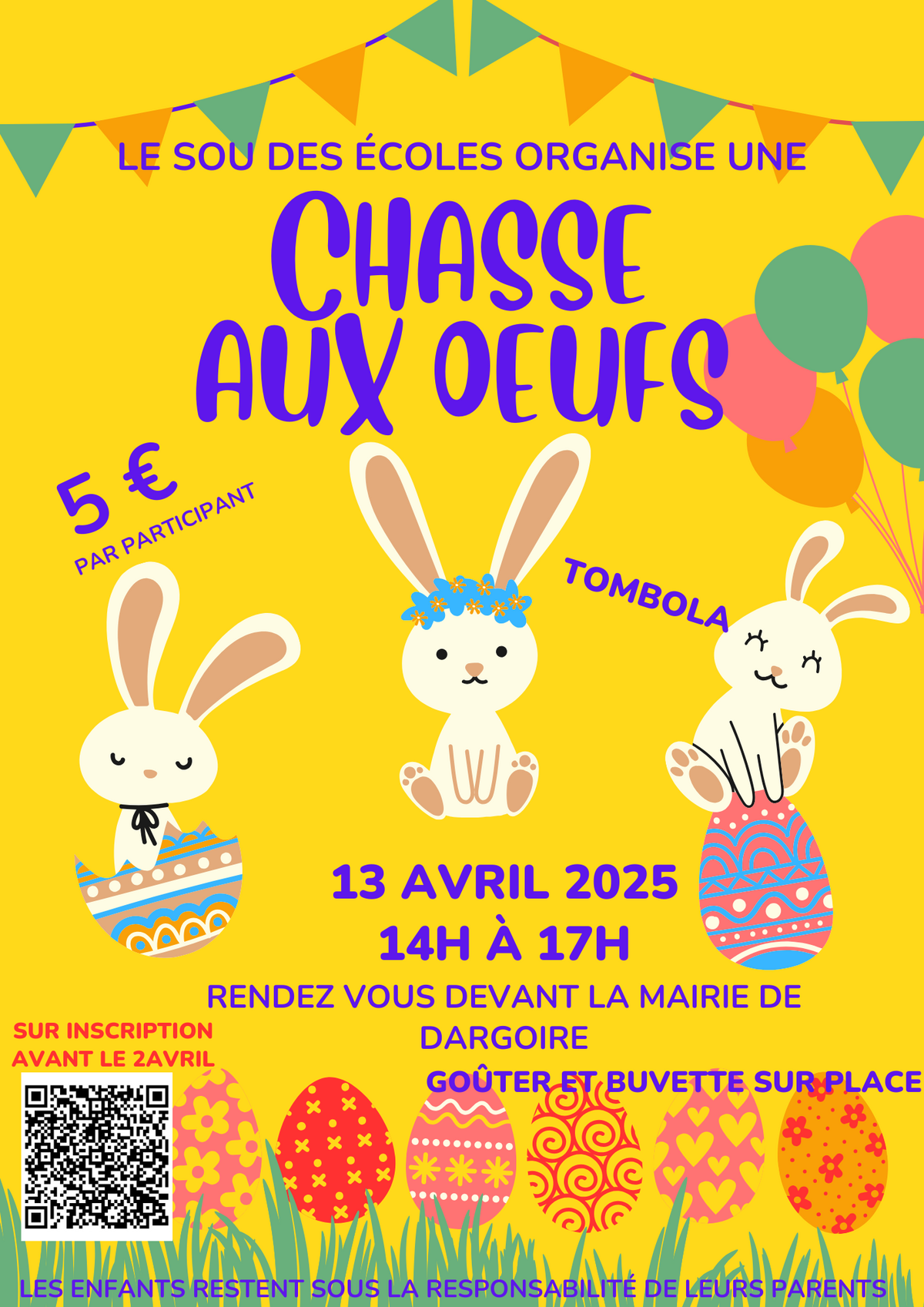 Le dimanche 13 avril de 14h à 17h grande chasse aux œufs dans le bourg de Dargoire, organisée par le sou des écoles.