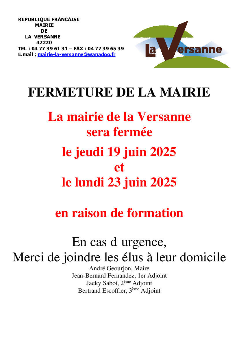 FERMETURE DE LA MAIRIE 25-06-17 La Mairie de la Versanne sera fermée le jeudi 19 juin et le lundi 23 juin pour raison de formation. Bonne journée