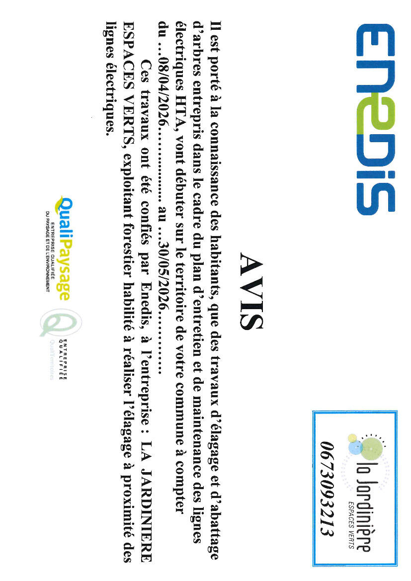 Avis de travaux d'élagage du 08/04/2026 au 30/05/2026, travaux confiés par Enedis à l'entreprise La Jardinière Espaces verts.