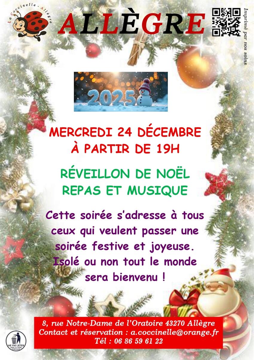 • Repas de Noël, 24 décembre à 19h00. Réservation obligatoire avant le 20 décembre. Renseignements : 06 13 19 36 46